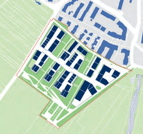 Les bâtiments sont implantés selon un axe nord-est/sud-ouest, dans le prolongement d’un quartier situé au nord-est. Cette configuration permet de conserver des cônes de vue vers la plaine depuis l’espace public. Les logements sont majoritairement traversants avec une exposition sur des allées-prairies publiques, qui desservent les différents lots, et l’autre sur des cours résidentielles privées avec jeux d’enfants. Les typologies vont du T1 au T5, un des lots propose des logements en co-living (T15 avec mutualisation d’espaces communs).