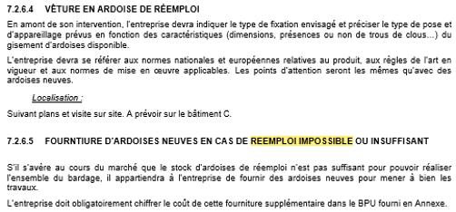 Pour réaliser le réemploi in-situ, et parfois aussi pour des matériaux de réemploi sourcés à l’extérieur, certains produits et matériaux peuvent nécessiter d’être triés, nettoyés, reconditionnés, transformés, rénovés afin d’assurer le respect des DTU de mise en œuvre. Toute opération de préparation des gisements de réemploi en vue de leur mise en œuvre sur le chantier de réhabilitation est réputée à la charge de l’entreprise et devra être chiffrée comme telle dans la ligne dédiée à la pose des produits et matériaux.