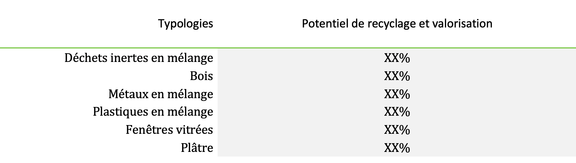 - XX% a minima des déchets inertes (valorisation matière) [à personnaliser] ;
