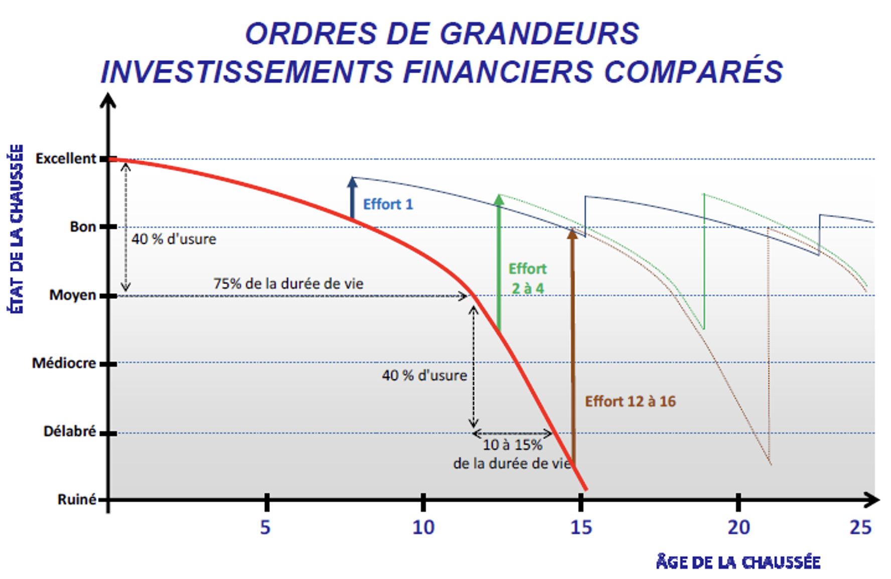 NB : sujet non abordé ici mais pourtant crucial pour limiter les flux entrants et sortants de matériaux : la question de la maintenance des voiries. En effet, une maintenance optimisée permet d’allonger la durée de vie des voiries, comme le présente le schéma ci-dessous :