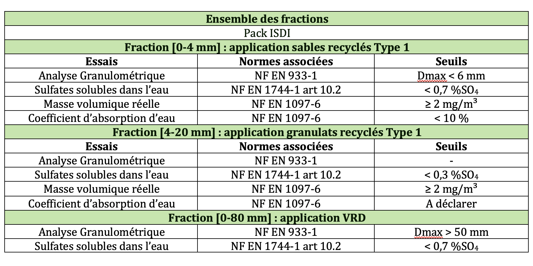 NB : Les essais recommandés sont basés sur les essais nécessaires à la production de granulats type 1 selon la norme NF EN 206+A2/CN, mais seulement certains sont jugés pertinents à cette étape. La pertinence de ces essais est jugée selon leur importance pour réussir à produire des granulats type 1 ; mais aussi sur le fait que certains des essais ne sont pas à ce stade représentatifs du produit final que seront les granulats après curage et déconstruction.
