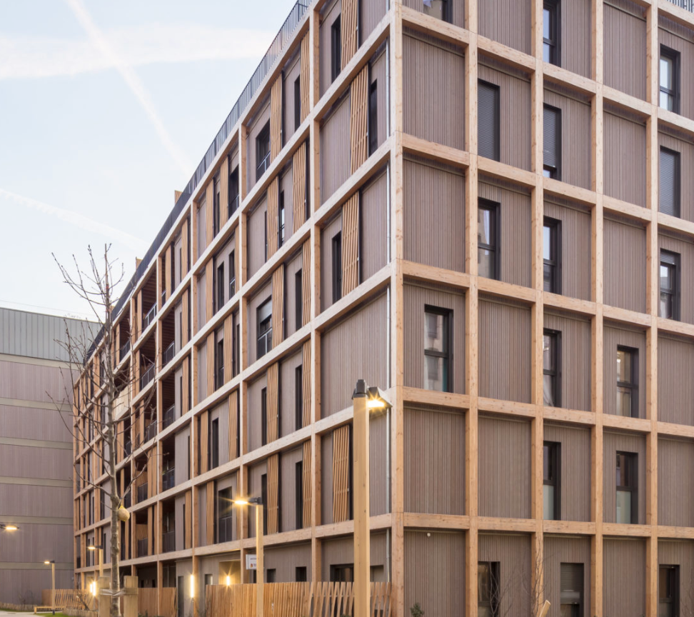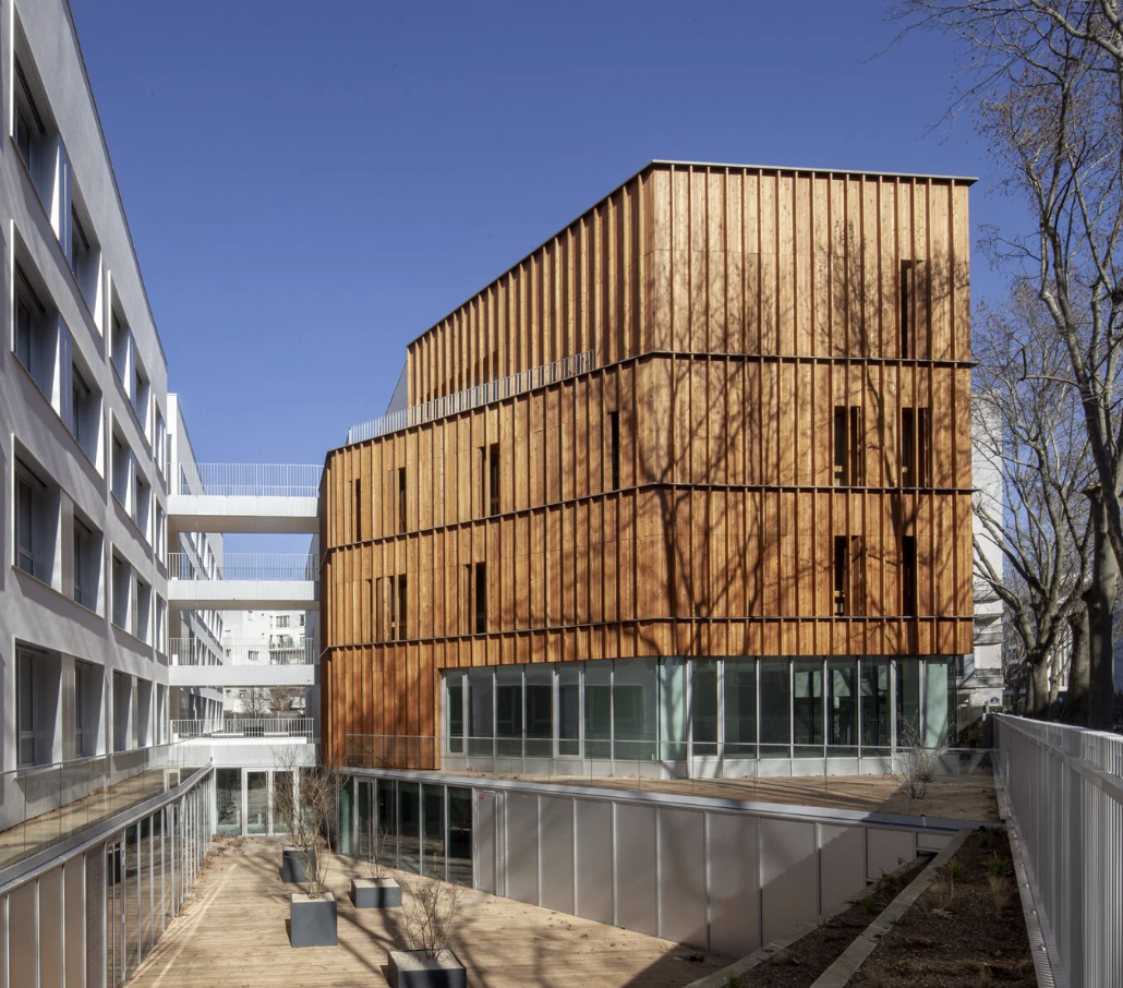| avenue Parmentier (Paris, 11ème) MOE: Téqui MOA: Batigère Habitat Livré en 2025 | => 63 logements et 1 commerce Fiche Tequi surélévation de 3 niveaux (appui sur de nouvelle structure), structure mixte bois-métal à ossature et bardage bois démolition des rampes pour créer des cours au coeur de l'îlot |