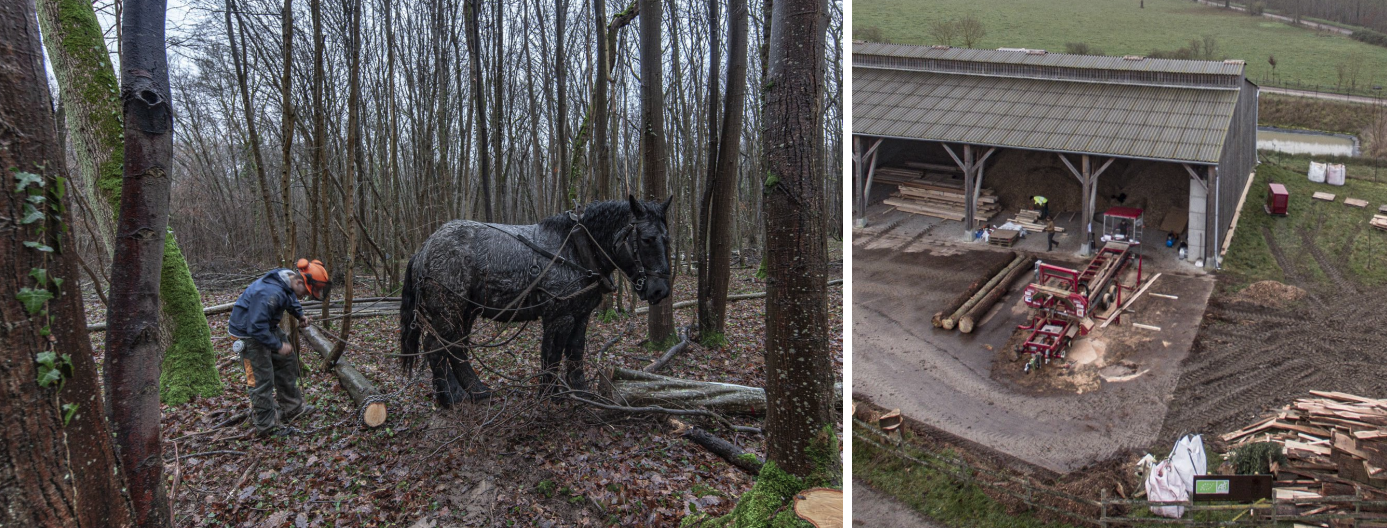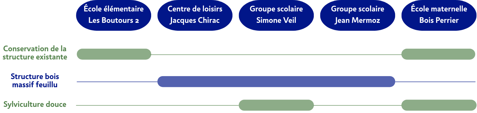 Elle a ainsi pu acheter à deux reprises du bois en maîtrisant l’ensemble de la chaîne de transformation : sélection des arbres sur place, débardage à cheval, installation d’une scierie mobile sur le site. Après quelques mois de séchage — insuffisants pour obtenir un bois sec — le bois a été employé pour réaliser des auvents dans les cours du groupe scolaire Simone Veil ou des protections solaires extérieures sur le projet de la maternelle Bois-Perrier.