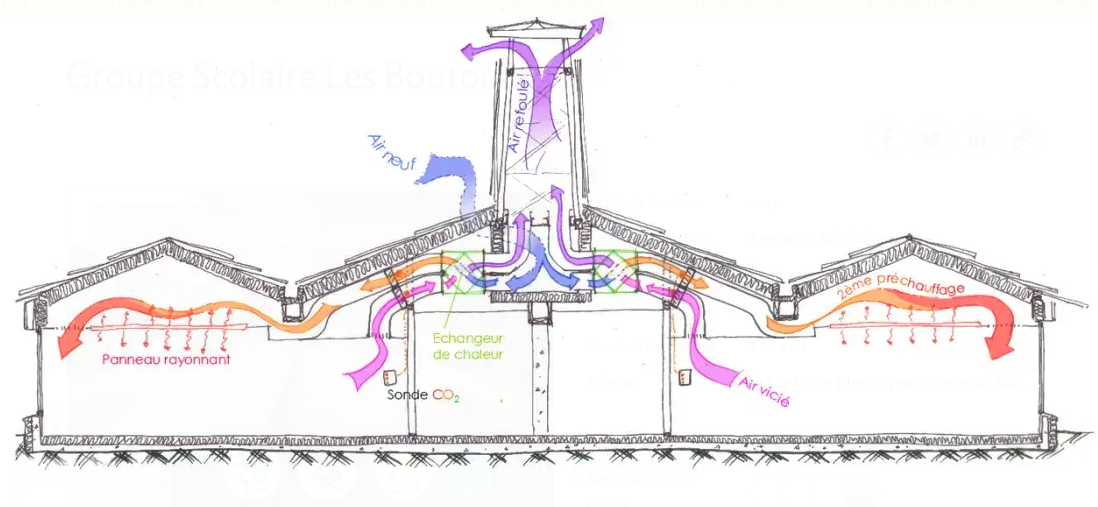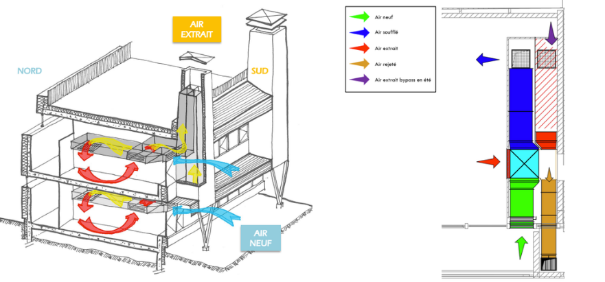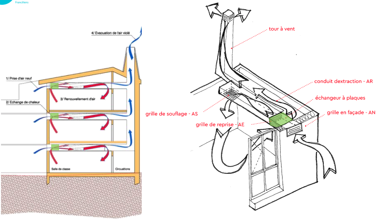 Les prises d’air neuf sont situées en façade, l’air neuf traverse l'échangeur puis chemine ensuite de panneaux rayonnants avant d’arriver dans la classe, en fond de salle (flèches bleues). L’air vicié est extrait directement via l’échangeur situé en façade, puis circule dans une gaine avant de s’élever dans les tours à vent positionnées au centre du bâtiment (flèches jaunes).