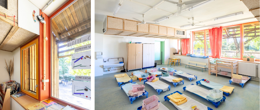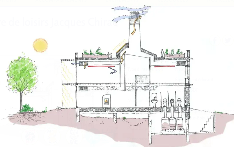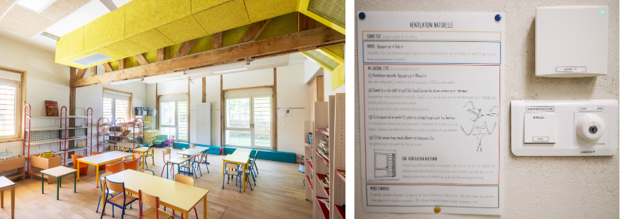 Pour le groupe scolaire Jean-Mermoz, l’objectif était de créer des bâtiments capables de maintenir leur fonctionnement même lors de canicules prolongées, lorsque l’inertie thermique ne suffit plus. Le centre de loisirs et l’école maternelle sont ainsi reliés à un puits climatique qui rafraîchit l’air neuf en été (cf. onglet Ventilation naturelle). En cas de fortes chaleurs, les usagers peuvent activer des “boutons canicules”, installés dans toutes les salles du centre de loisirs ainsi que dans les salles de sieste et d’activité de la maternelle. Leur activation déclenche des moteurs qui renforcent le tirage thermique et amènent de l’air frais dans les espaces intérieurs.