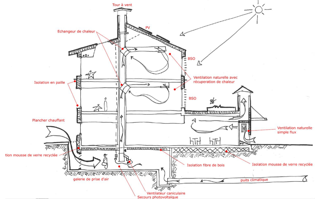 Dans le groupe scolaire Jean Mermoz, l’air neuf rentre par une galerie technique située en sous-sol des bâtiments. Cette galerie est connectée à deux puits climatiques (un par bâtiment) qui préchauffent l’air neuf en hiver et le rafraîchissent en été. L’air neuf circule ensuite dans un conduit vertical, situé au centre du bâtiment, puis dans des gaines en plafond avant d’entrer dans les salles de classe, à proximité des façades. L’air vicié est extrait en fond de salle, puis s’élève dans les tours à vent.