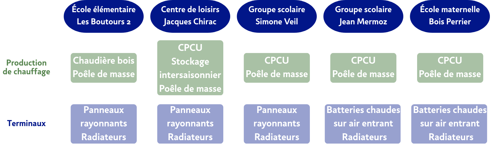 Le PLU de la ville de Rosny-sous-Bois impose le raccordement au réseau de chaleur de la ville, qui présente un taux d’énergie renouvelable et de récupération (ENR&R) supérieur à 80 %. L’ensemble des bâtiments y sont donc raccordé, à l’exception du groupe scolaire Les Boutours 2, trop éloigné des infrastructures existantes. Ce dernier est donc équipé d’une chaudière bois.