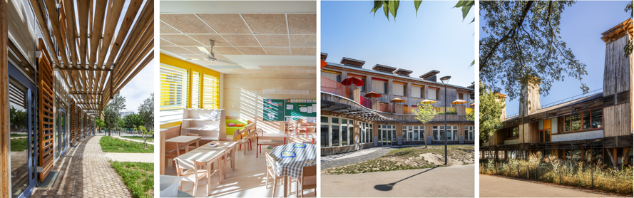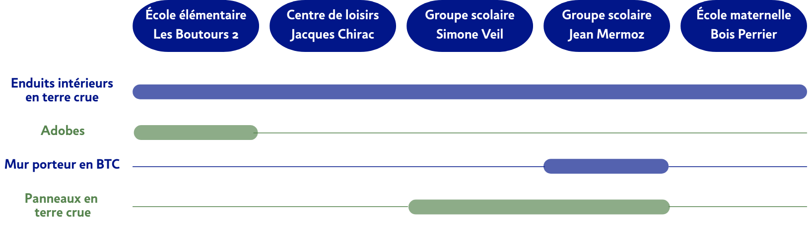 Bien que les structures des bâtiments soient majoritairement en bois, la mise en œuvre de murs épais isolés en bottes de paille et l’intégration de terre crue — pour les enduits intérieurs, certaines cloisons (plaques de terre crue) et des murs porteurs (briques de terre comprimée) — apportent une forte inertie thermique. Le groupe scolaire Jean Mermoz contient une quantité plus importante de terre crue. Il sera intéressant de comparer le niveau de confort estival de ces bâtiments avec les autres établissements pour déterminer l’impact de l’inertie thermique de la terre crue.