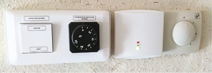 Le flux d’air est régulé par des registres rectangulaires situés devant les échangeurs. La modulation de l’ouverture des lames des registres est pilotée manuellement par des leviers actionnables par les usagers. Des sondes de CO2 sont installées dans chaque pièce pour leur donner une indication de la qualité de l’air.