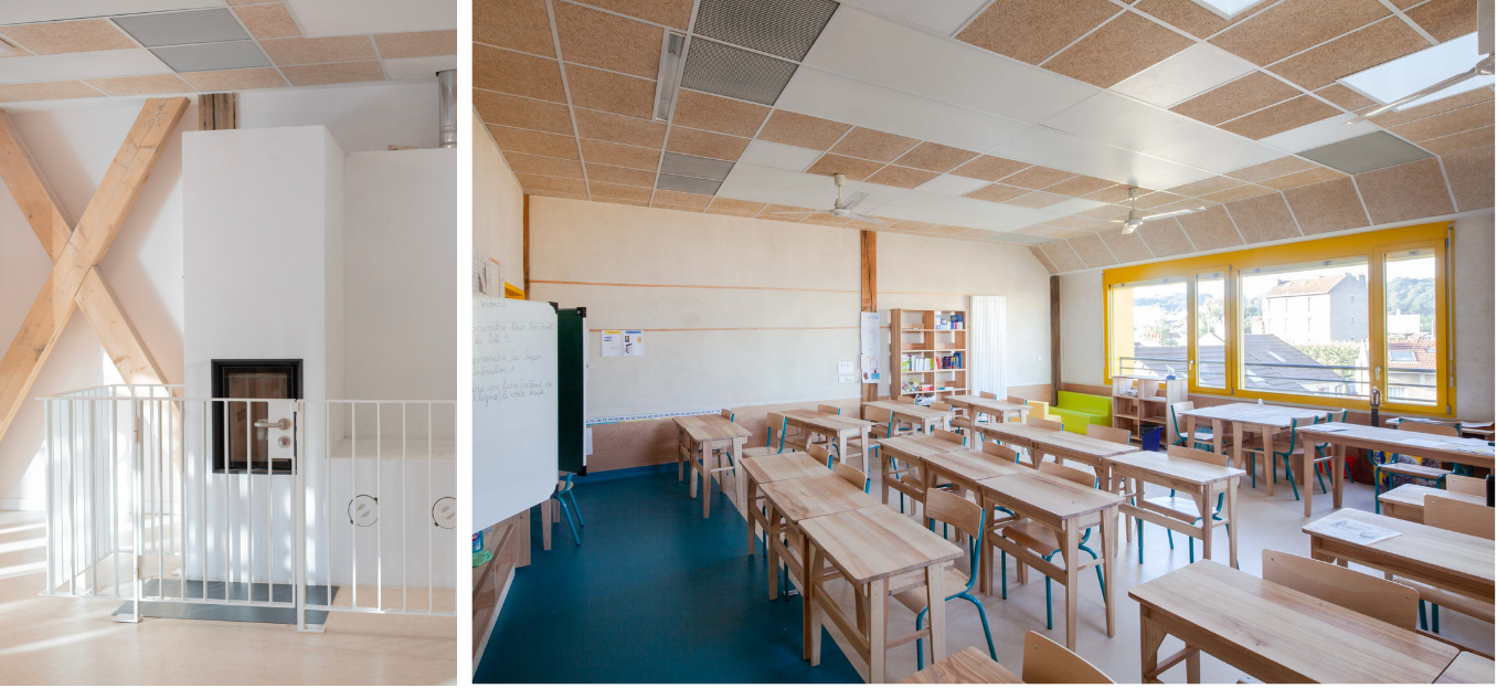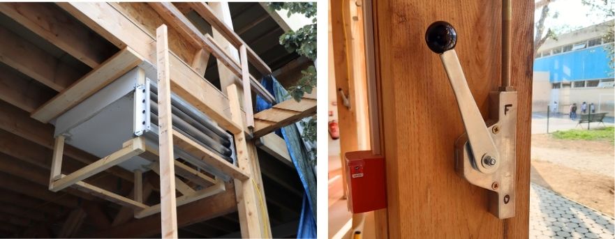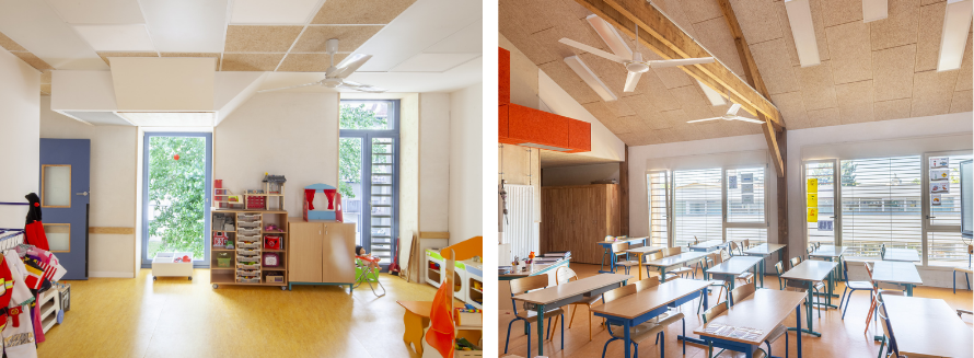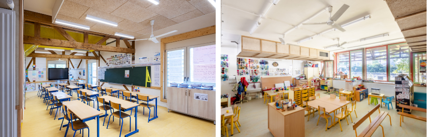 Chaque salle de classe est dotée d’ouvertures dédiées à la ventilation naturelle nocturne, permettant d’évacuer la chaleur accumulée. Elles sont également équipées de brasseurs d’air afin d’améliorer le confort des occupants pendant la journée.