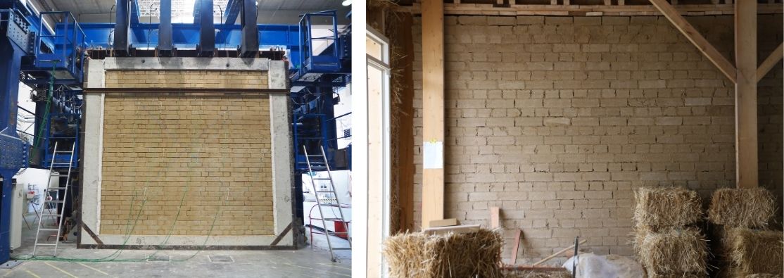 Des liens en chanvre ont également été testés pour pour lier les lisses basses et hautes comprimant les bottes de paille porteuse sur le mur test de précompression du centre de loisirs Jacques Chirac. Une fois le mur enduit, le chanvre s'est dégradé sous l’effet de l’humidité.