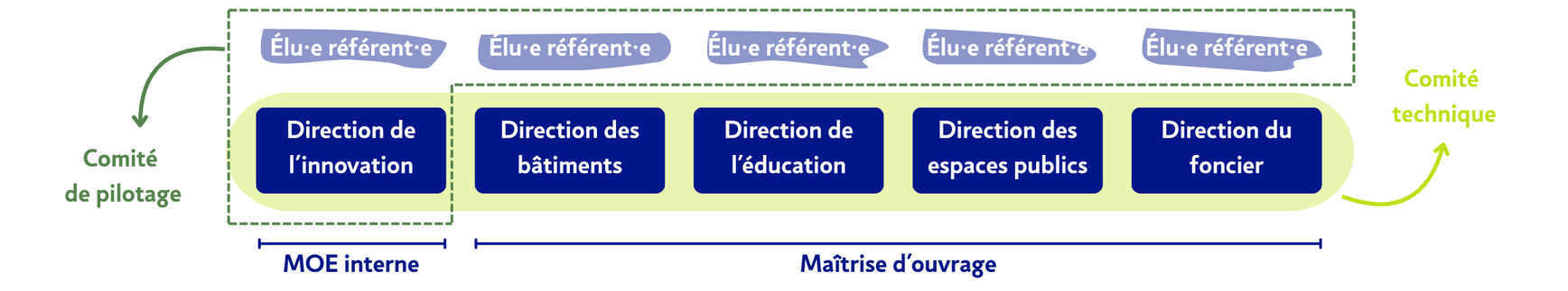Le comité technique, composé des différentes directions concernées par le projet (direction de l’éducation, direction des bâtiments, direction des espaces publics dont le service des espaces verts, direction de l’urbanisme, direction recherche et innovation) : il anticipe les différents blocage potentiels (temps de passation des marchés, suivi financier de l’opération, situation de précontentieux), prépare les comités de pilotage et veille à la cohérence du projet avec les objectifs définis dans la lettre de mission ;