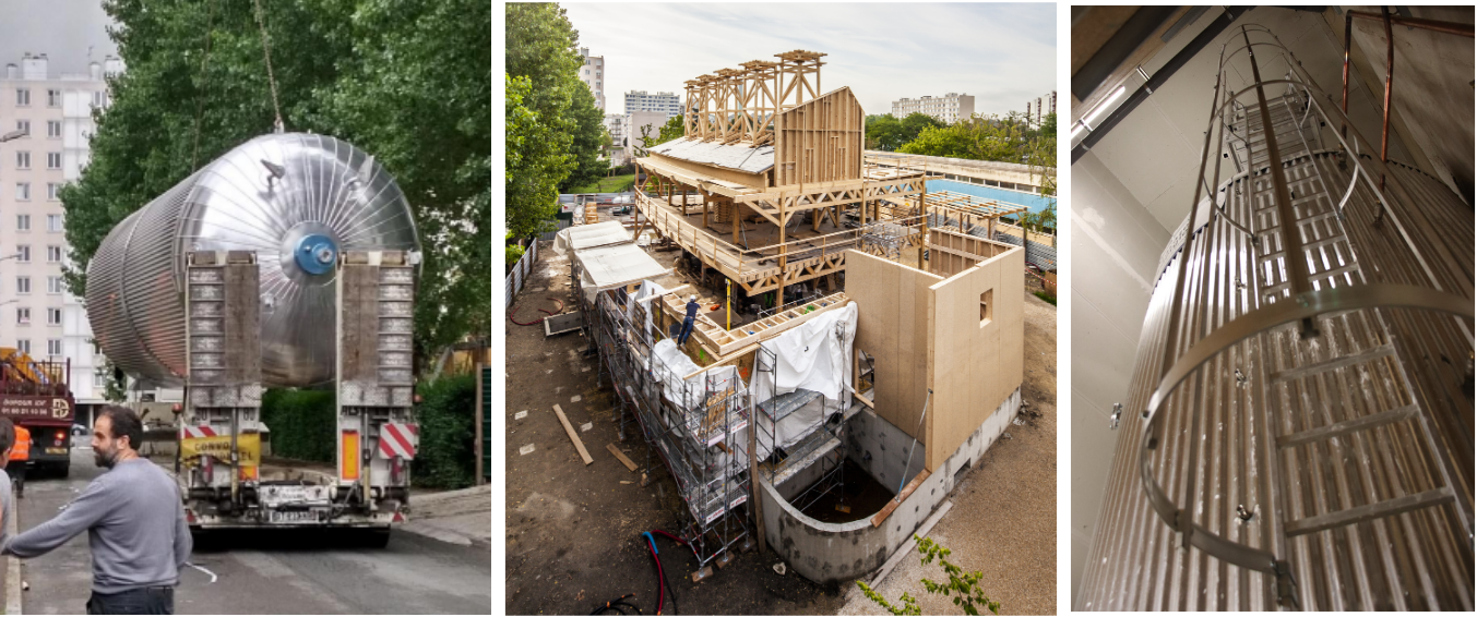 La cuve utilisée est une ancienne citerne de jus d’orange récupérée en Belgique, transformée et isolée avec de la fibre de bois et de la tôle à Toulouse avant sa livraison sur site.