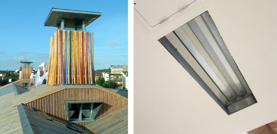 Pour le centre de loisirs Jacques Chirac, l’objectif était de concevoir des installations de ventilation naturelle plus petites. A partir de ce projet, l’ensemble des gaines sont réalisées en plaques fibres-gypse.