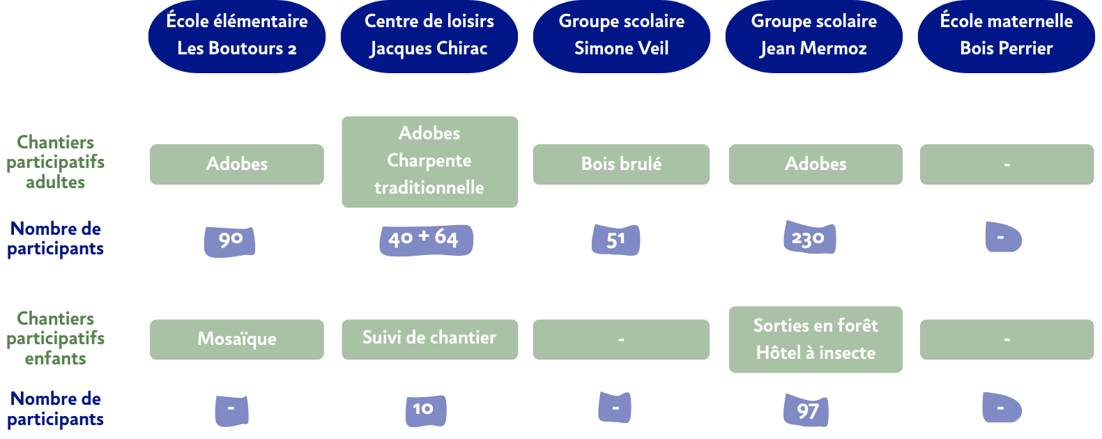 Plusieurs ateliers et chantiers ont été menés avec les enfants : la fabrication de mosaïques sur les thèmes « liberté, égalité, fraternité » et les grands écosystèmes, une exposition sur la construction du centre de loisirs Jacques Chirac présentée lors de son inauguration, un hôtel à insectes.