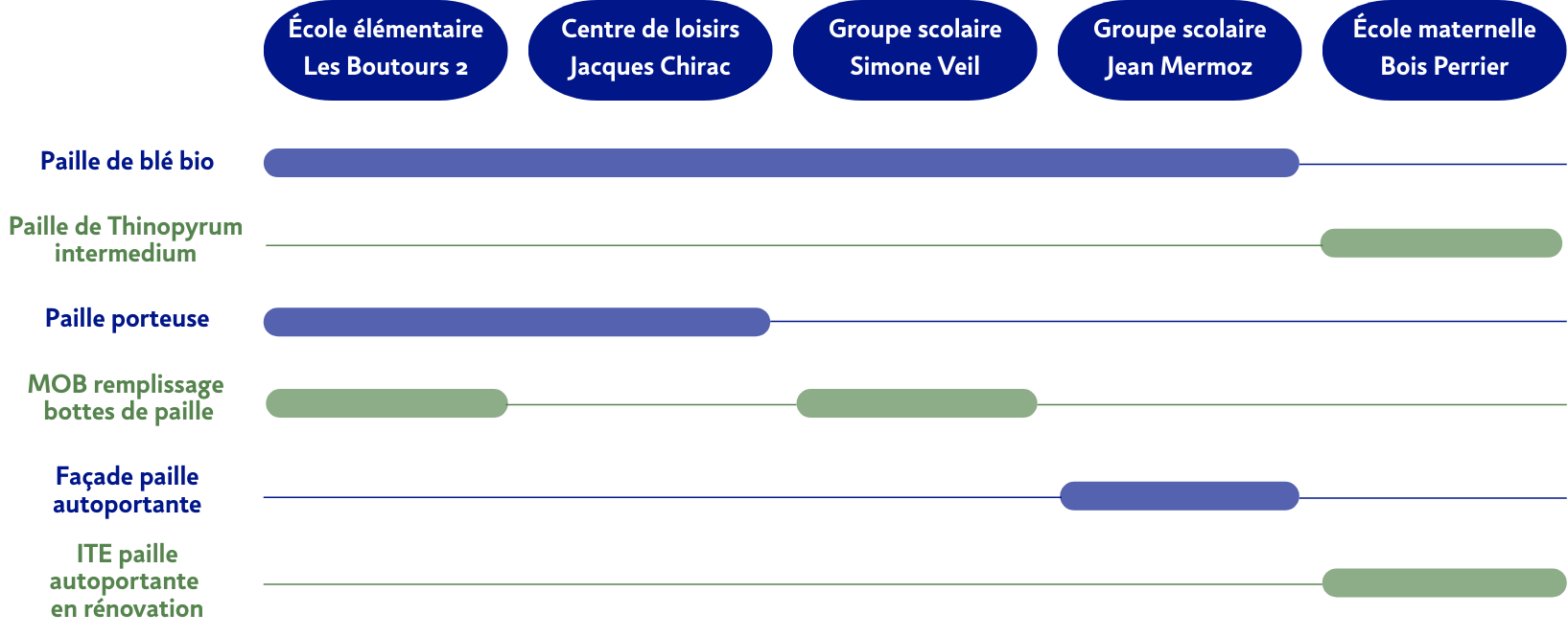 En parallèle, la DRI a identifié un premier fournisseur de bottes de paille bio en Seine-et-Marne (Paille Service). Bien qu’il s’agisse d’un fournisseur local, il n’existait pas encore à l’époque de lien direct avec les agriculteurs. Ce n’est qu’à partir du projet du centre de loisirs Jacques-Chirac que des premiers contacts ont été établis avec des exploitants agricoles, dont l’un engagé dans une démarche d’agroforesterie.