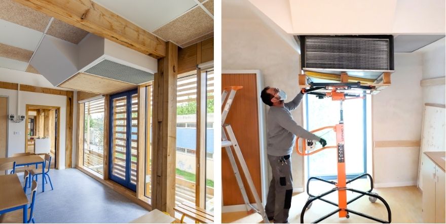 Préchauffage 2 : l’air neuf circule dans le plenum de faux-plafond (donc au-dessus des panneaux rayonnants) avant d’arriver dans les salles de classe.