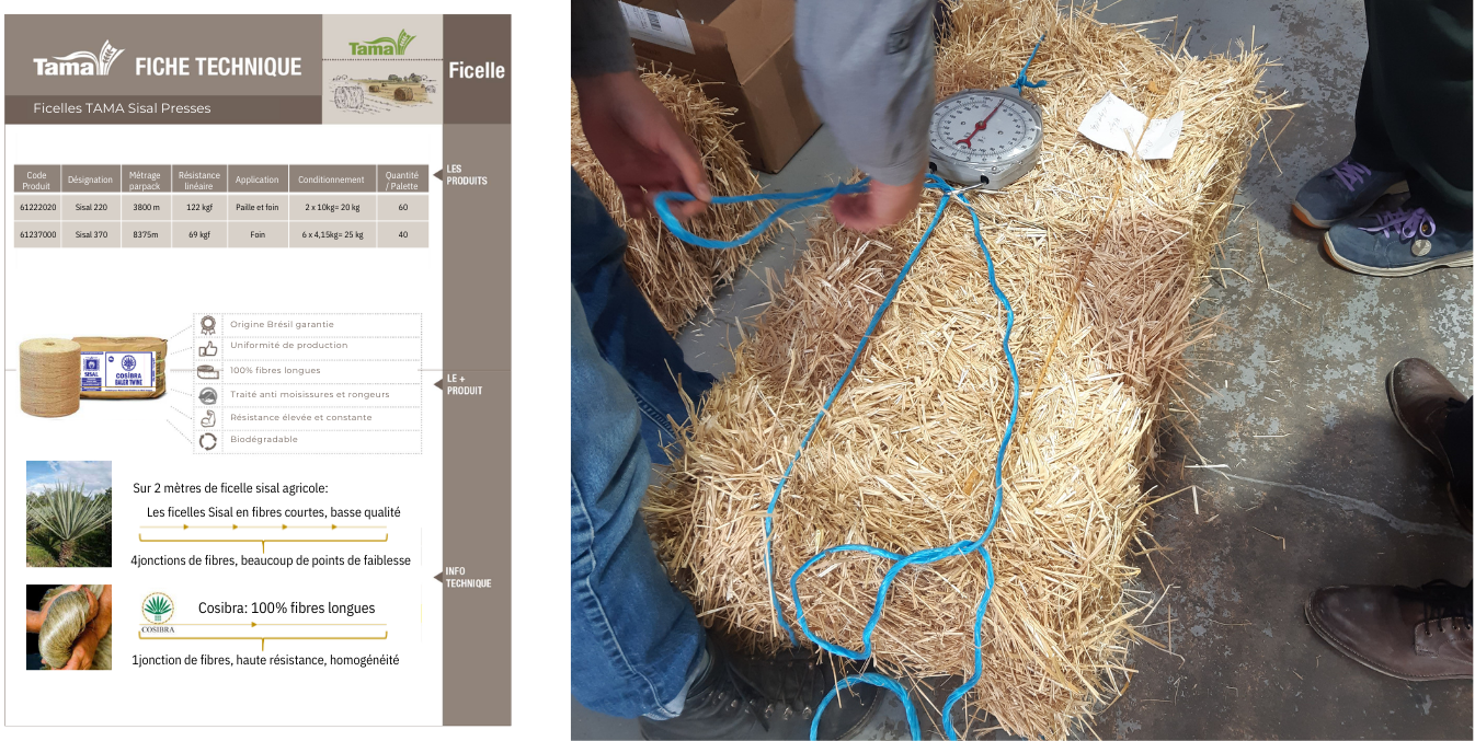 Dans sa démarche visant à concevoir des bâtiments compostables, la DRI a cherché à substituer le lien des bottes de paille en polypropylène par un lien en matériau naturel. Aujourd’hui, le matériau naturel encore compatible avec les botteleuses est le sisal. Cependant, cette fibre ne pousse pas en Europe, mais principalement en Amérique du Sud (Brésil). La DRI a tout de même identifié un fournisseur européen et a pu tester son utilisation sur le projet du groupe scolaire Jean Mermoz : les résultats au moment du bottelage étaient prometteurs, mais les liens avaient tendance à se rompre lors du transport, compliquant le travail des entreprises chargées de la manutention et de la pose.