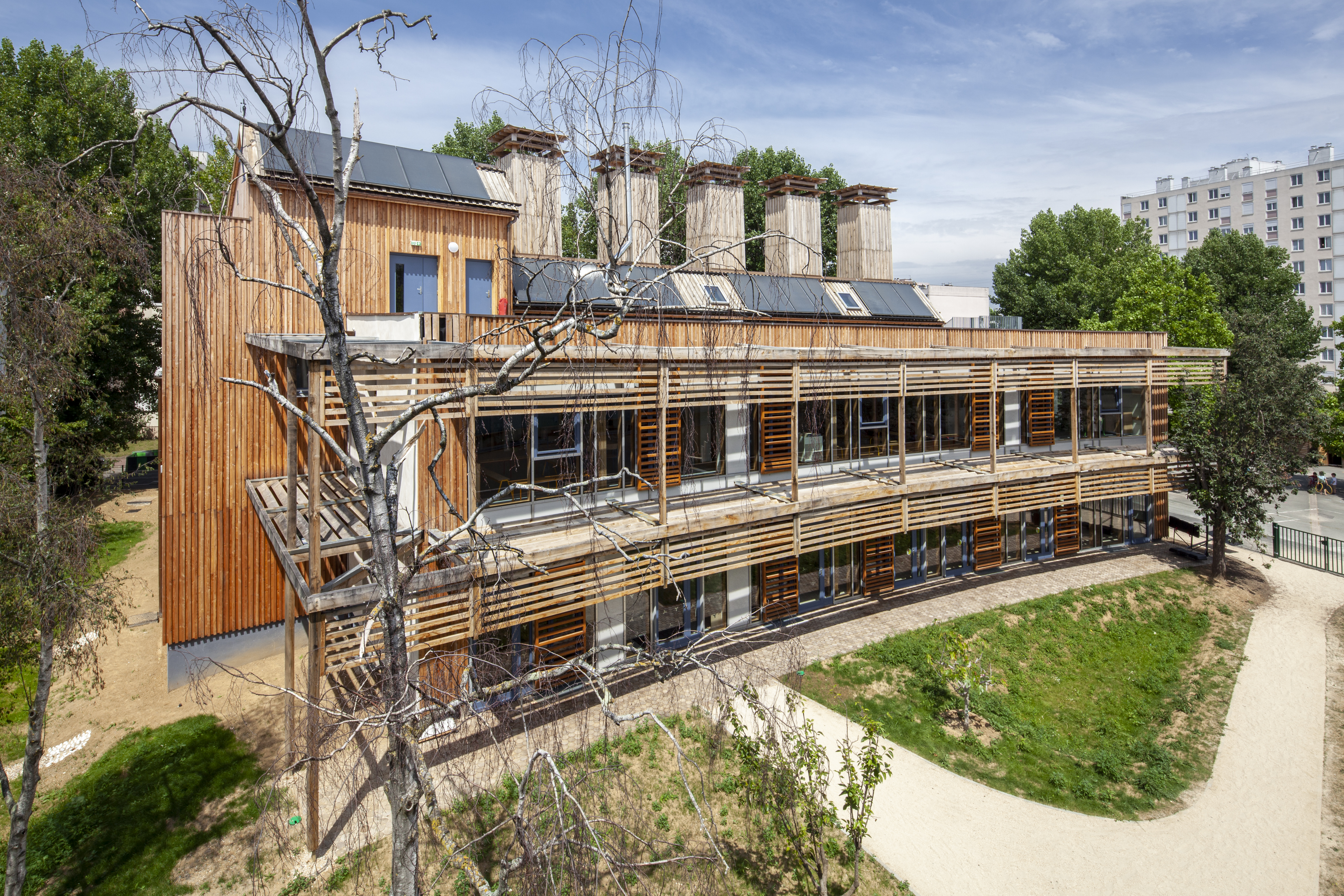 Dans un environnement pavillonnaire en région parisienne, les architectes exploitent astucieusement la petite parcelle en installant une cour sur le toit de l'école. Cette décision audacieuse libère de l'espace au sol, répondant ainsi aux exigences de 40 % de sols perméables, tout en offrant des jardins pédagogiques accessibles de plain-pied aux classes du rez-de-chaussée. Sur la façade sud, une composition alternant panneaux photovoltaïques, larges baies vitrées et brise-soleil met en valeur l'engagement écologique de l'école.