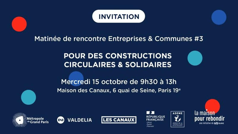 Les Canaux et la Métropole du Grand Paris organisent une matinée de rencontre entre entreprises et communes sur le thème “Construction circulaire et solidaire" pour mettre en lien porteur·teuses de solutions circulaires et donneur·neuses d'ordres engagé·es dans le secteur du bâtiment !