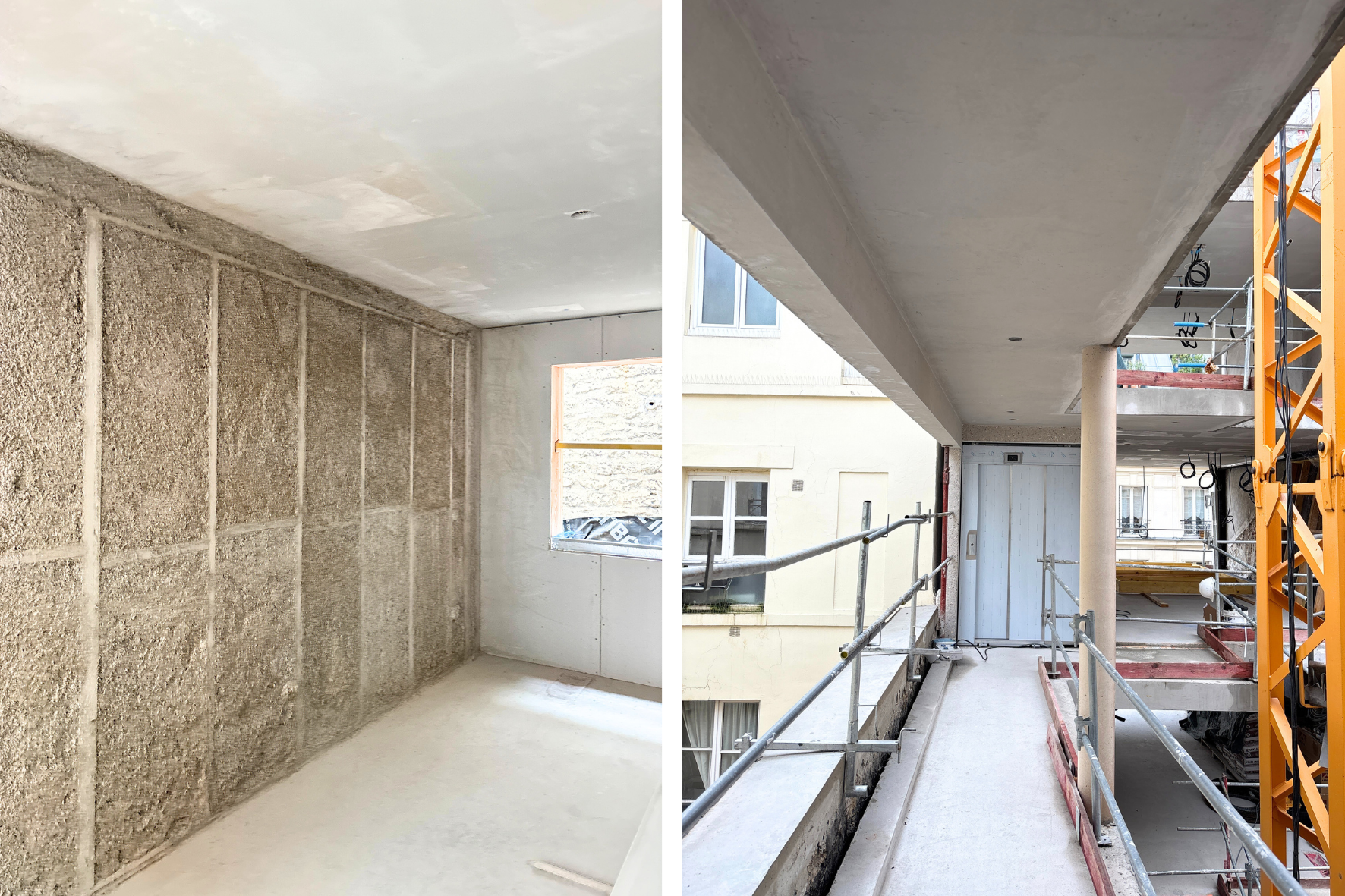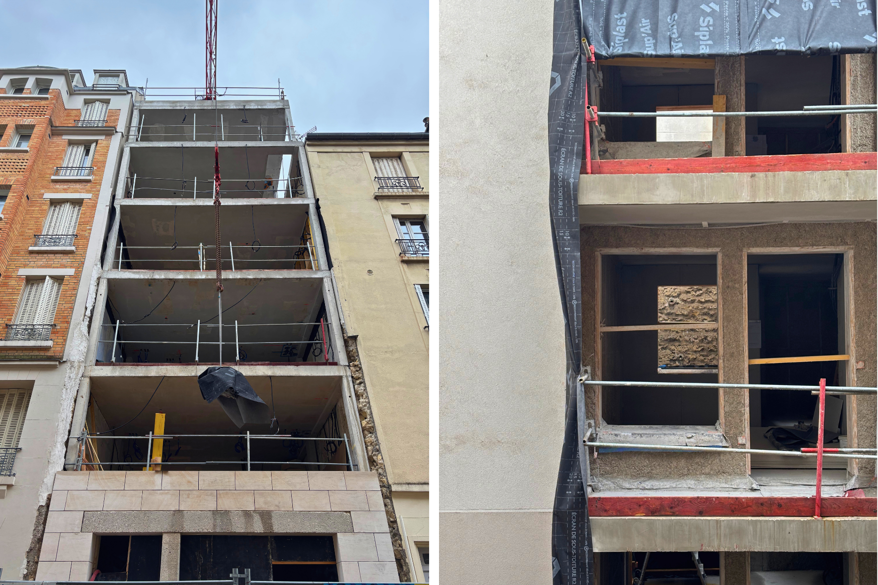 Le projet se situe à l'emplacement d'un bâtiment en R+2 en très mauvais état sur une parcelle très étroite. L'agence Dalin & Bourgoin architectes accompagnée par AXOE et E2, proposent à la RIVP la construction d'un immeuble en R+5 ; composé de sept logements sociaux (3 T2, 1 T3 en duplex, 3 T1) et d'un commerce. La structure est un poteau-dalle béton et les façades sont des FOB béton de chanvre ; mur en pierre en RDC. Il s'agit de l'un des premiers chantiers à sortir après les nouvelles règles professionnelles du chanvre. Dans ce contexte, pour accompagner la RIVP, LM Ingénieur a un rôle d'AMO pour la réalisation d'essais complémentaires comme l'essai AEV. LM Ingénieur a également été choisi par l'entreprise générale, BRB, pour les études d'éxécution de l'enveloppe chanvre.