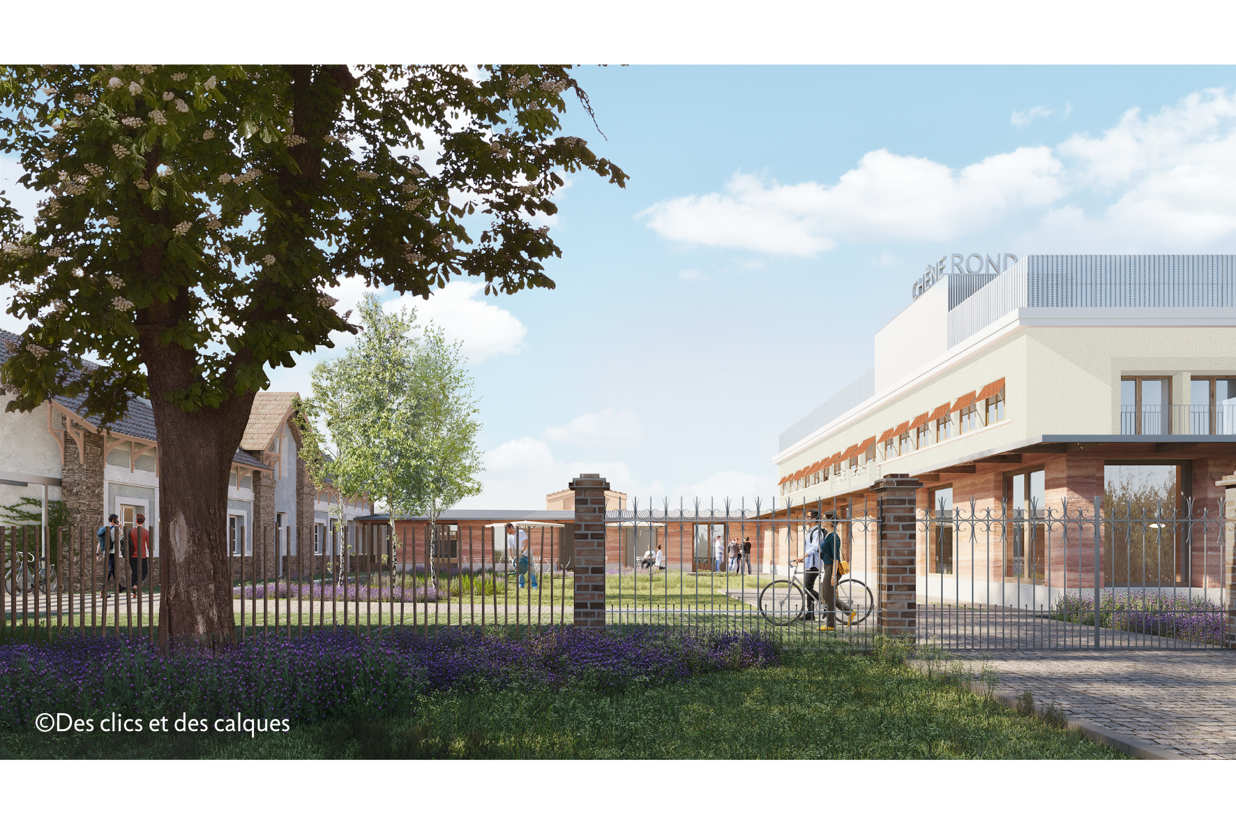 Le tiers-lieu prendra place dans les anciens communs du château du Chêne-Rond. Les bâtiments de « l’armée » et de « la ferme » seront entièrement restaurés et réaménagés. Les façades de l'extension seront realisées en pisé.