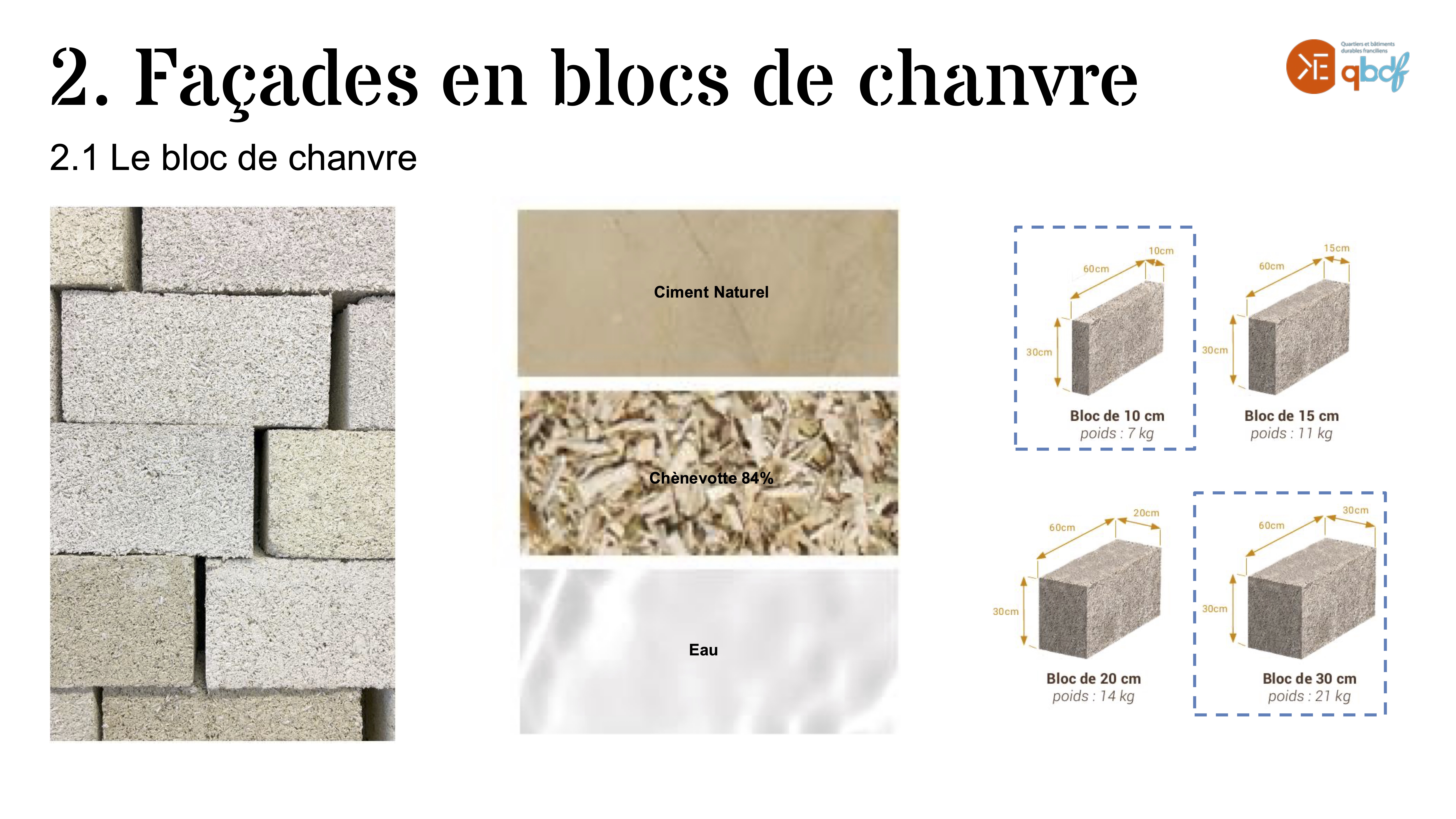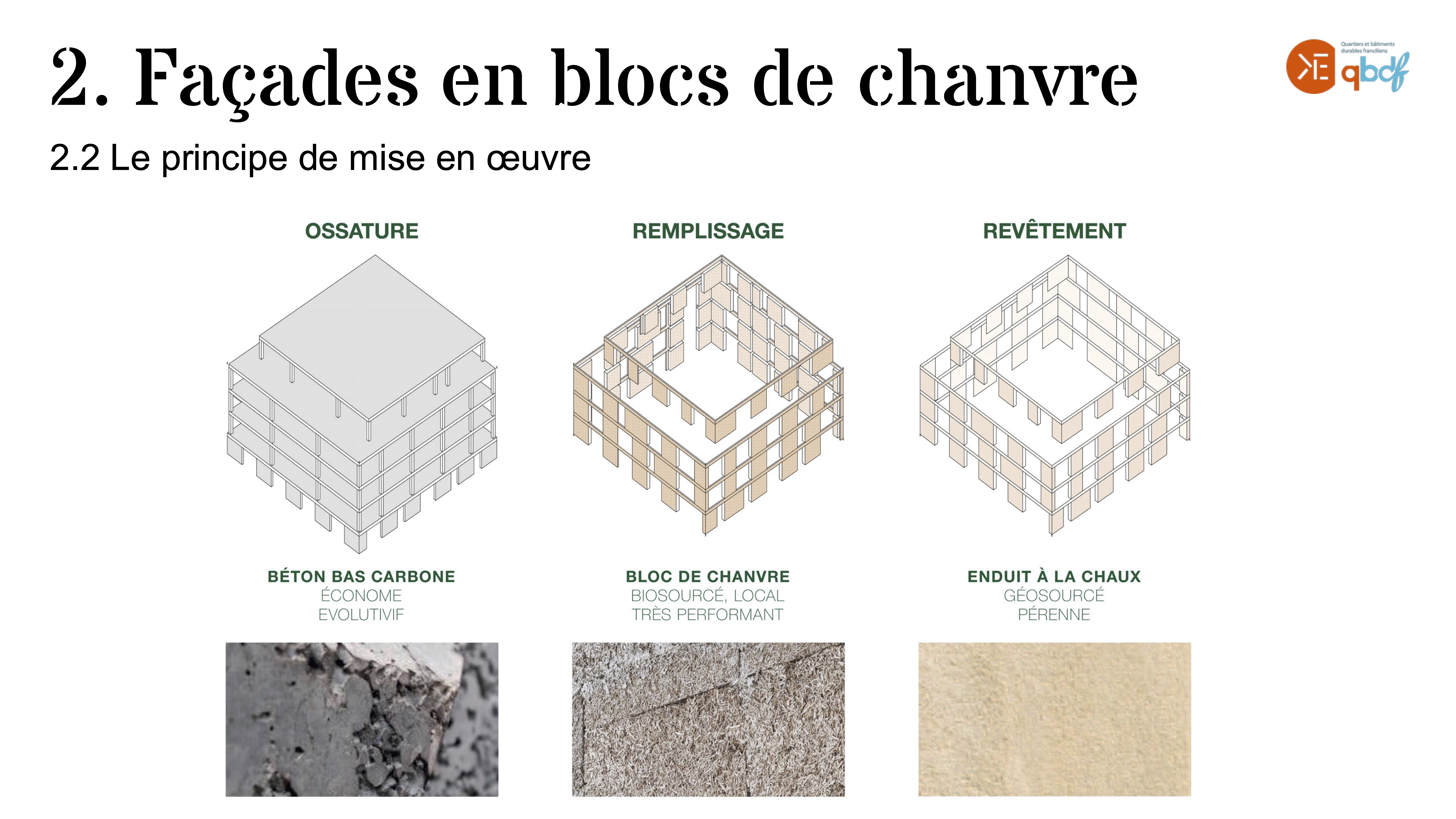 - une structure en béton et un remplissage en matériaux biosourcés, notamment des blocs de béton de chanvre,