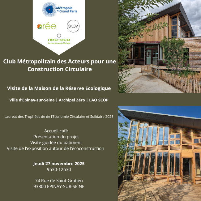 Lauréat d'un Trophée de l'Economie Circulaire et Solidaire de la Métropole du Grand Paris édition 2025, la Maison de la Réserve Ecologique est un bâtiment écoconstruit de plus de 500 m2, dédié à la pédagogie autour de la biodiversité et des sujets environnementaux. Conçue pour s'intégrer au mieux dans l'environnement de la Réserve Ecologique qui l'entoure, la Maison est un bâtiment zéro béton, entièrement réversible. De nombreux matériaux bio et géosourcés ont été utilisés pour sa construction : paille, bois, terre crue, etc. La volonté forte de la Ville d'Epinay-sur-Seine, alliée à l'engagement des agences Archipel Zéro et LAO Scop ont également permis la mise en œuvre d'un grand nombre de matériaux de réemploi (24% de la masse totale du bâtiment). La visite guidée permettra aux participant·e·s d'en apprendre plus sur le projet : co-construction du projet entre les acteurs, mise en œuvre du réemploi, et utilisation de matériaux bio et géosourcés.