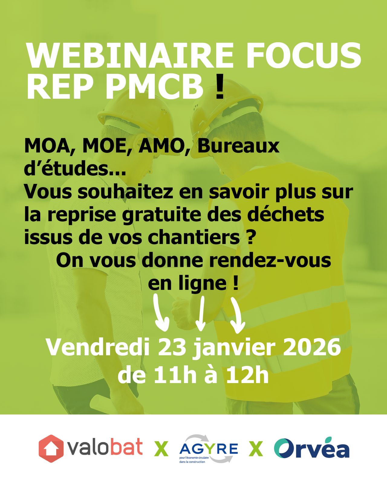 Agyre et Orvéa organise en partenariat avec Valobat un webinaire à destination des architectes, promoteurs, bailleurs sociaux et collectivités pour les sensibiliser à la REP PMCB. Il abordera la reprise gratuite des déchets, l'intégration des critères déchets dans les marchés et les opportunités que le diagnostic PEMD et le réemploi apportent.